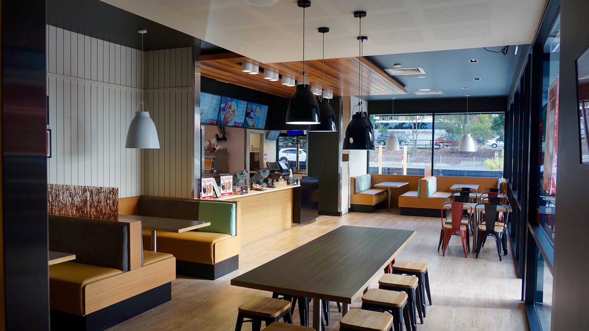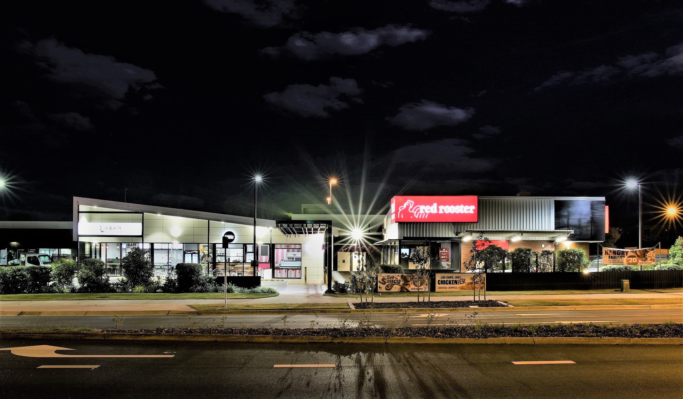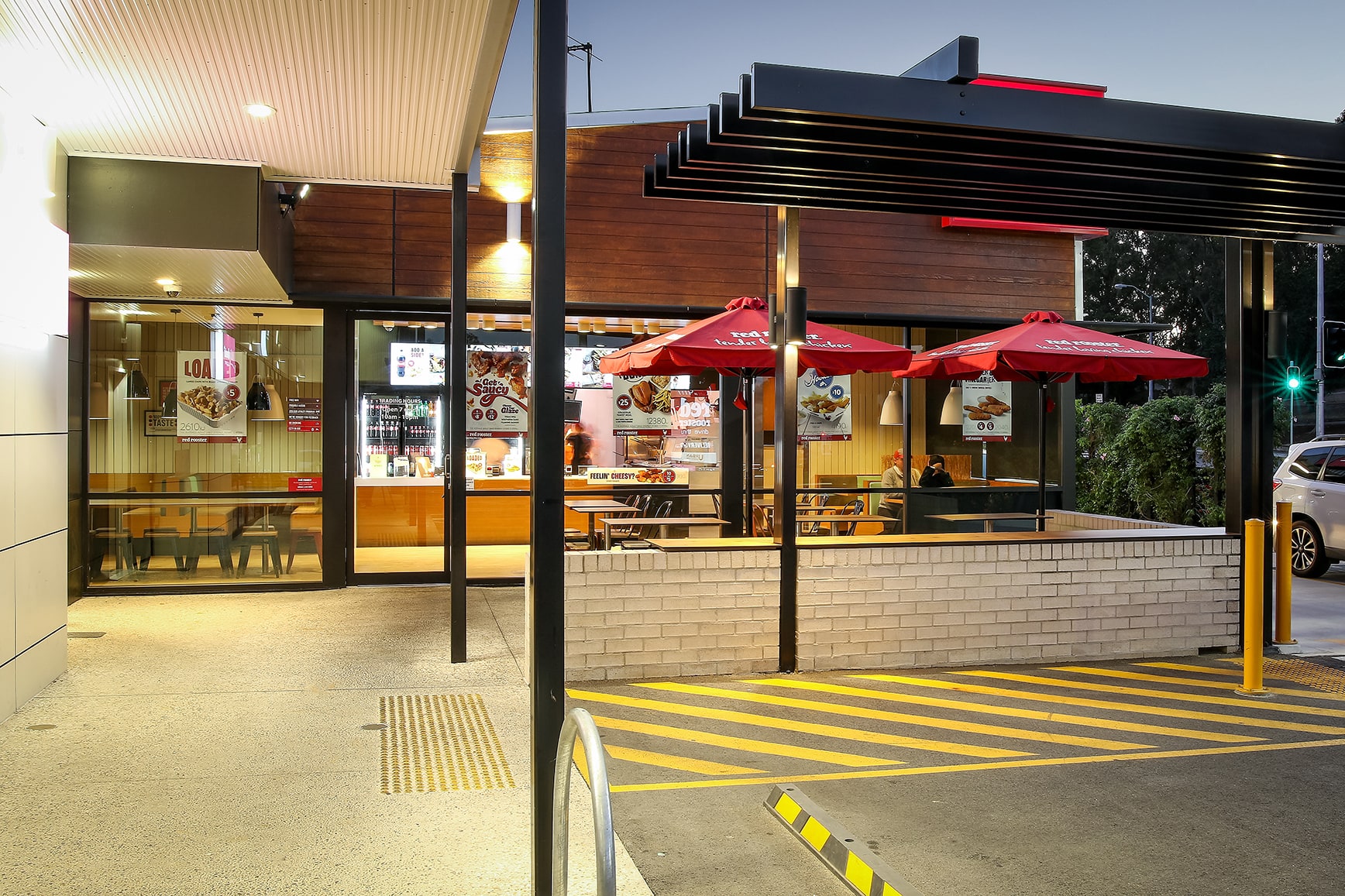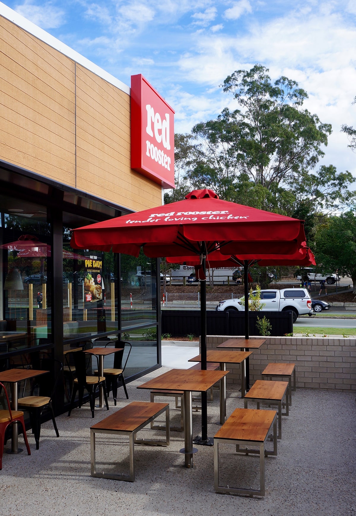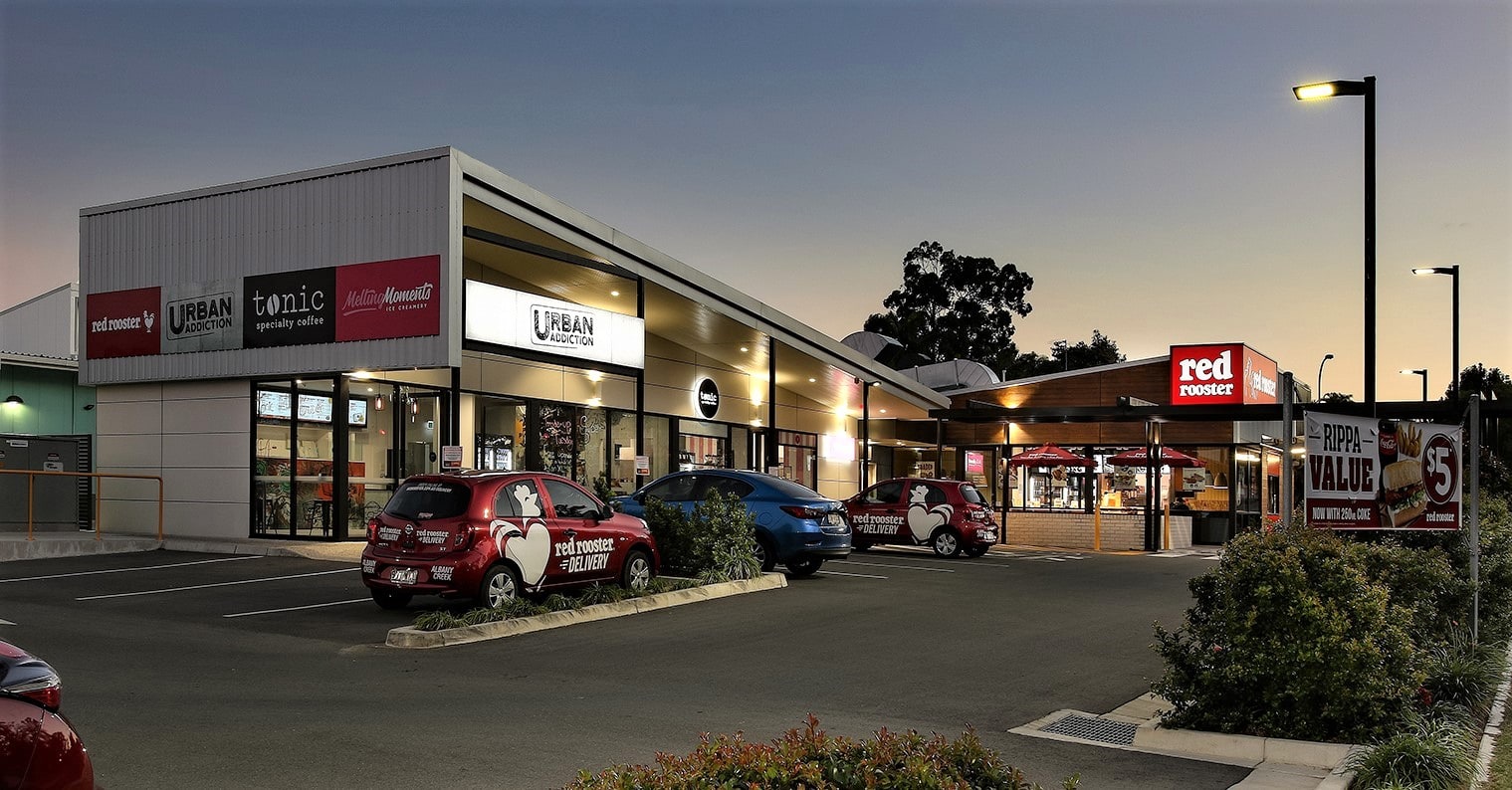 This small suburban retail development is positioned to the edge of a larger retail precinct and as such needed to create a point of difference and appeal to the local community to ensure its success. The design was anchored by a fast food operator’s requirement which directed the overall design in relation to vehicle circulation. In addition to the primary tenant we were able to create a second wing to the development to accommodate further tenancies and increase the appeal of the centre. The built form introduced opposing skillion roofs to align the scale of the buildings with the adjacent residences while maximising exposure for signage and provide a striking angular street elevation. The planning also had the benefit of creating outdoor seating to the North-East allowing the tenancies to take advantage of the SE Qld’s benign climate and further enhance street activation.